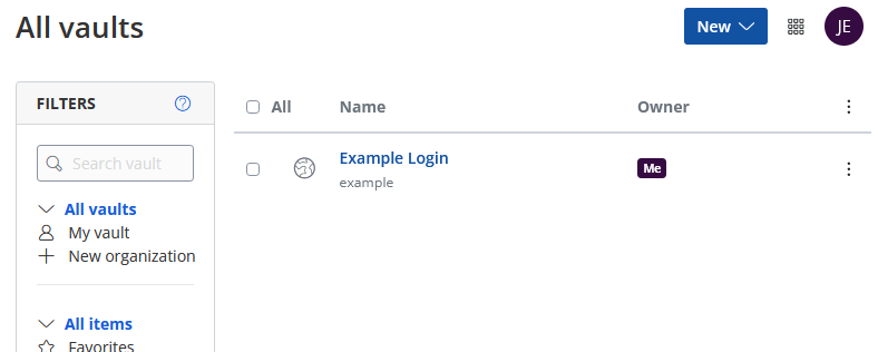 With just those 3 fields filled out, click "Save" and you will have saved your first password! You will now see the item in your vault: