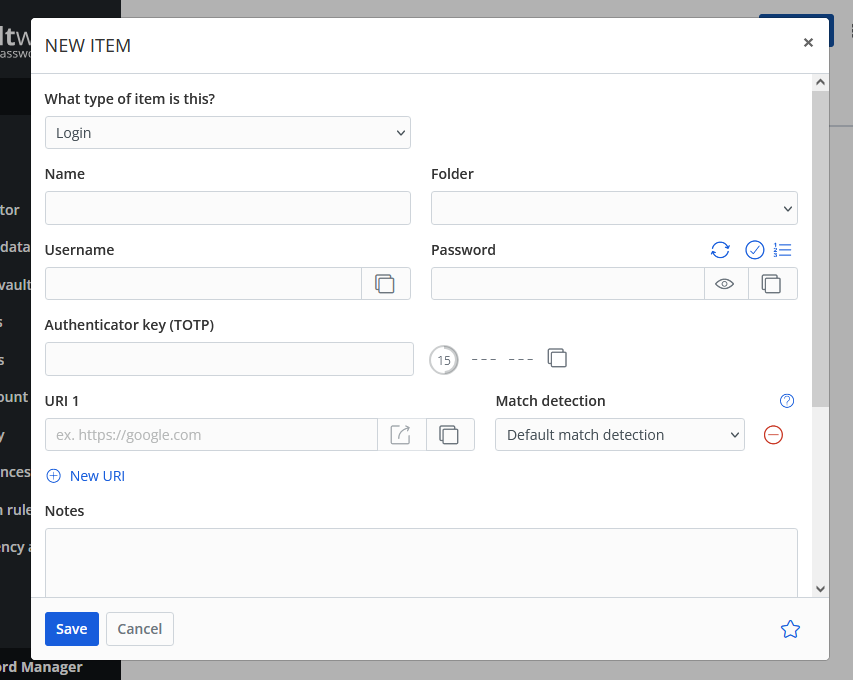- Password: This, naturally, is the password you're storing. You can click the eye symbol to the right of the password field to view what you're typing before you save it.