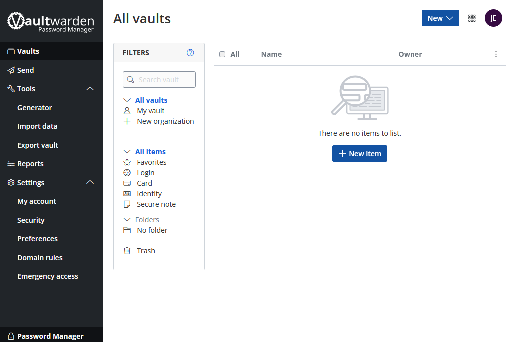Now that you have successfully set up a new account, you can proceed to using your vault. Once you're logged in at https://mypassword.care, you will be greeted with an empty vault: